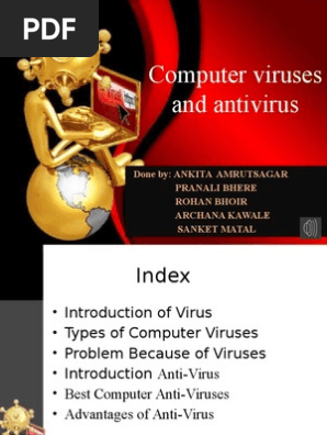 What is antivirus and its types pdf. ESET Antivirus comes with all the security tools that you may ever need to protect your data and privacy, including: Anti-theft support. However, despite a low-resource footprint being its highlight, this antivirus does its job. It runs silently in the background, and only performs system scans when it... A computer virus is a type of malicious code or program written to alter the way a computer operates and is designed to spread from one computer to another. A virus operates by inserting or attaching itself to a legitimate program or document that supports macros in order to execute its code. Our editors will review what you've submitted and determine whether to revise the article. The structure of each virus differs, and specific therapy is often unsuccessful because of periodic Anti-influenza drugs. Influenza is caused by two groups of RNA-containing viruses, influenza A and... What exactly the virus does depends on what the virus is written to do. Their primary goals however include replication and spreading, so viruses will generally The antivirus program usually can detect this type of viruses when they try spread by decrypted themselves. 11. Companion Viruses.