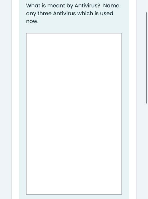 Solved What is meant by Antivirus? Name any three ... Sol) Antivirus is a kind of software used to prevent, scan, detect and delete viruses from a computer. Once installed, most antivirus software runs automatically in the background to provide real-time protection against virus attacks.