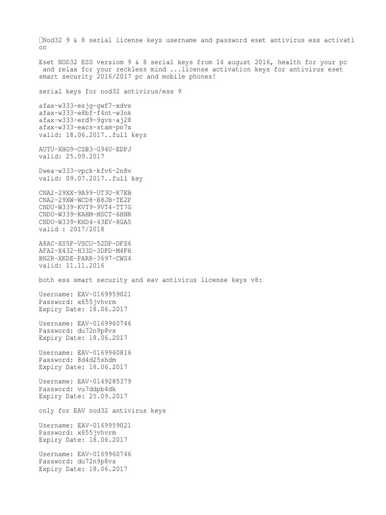 Free License Key ( trial license) ESET NOD32 Anti-Virus Free License Key ( trial license) ESET NOD32 Anti-Virus Free ESET License key | ESET NOD32 Antivirus | ESET Online ... ESET Windows home product full licenses are not free. ESET License key is unique sequence of symbols, letters, numbers or special signs provided by ESET in order to allow the legal use of ESET NOD32 Antivirus in compliance with End User License Agreement.Every End User is entitled to use the License key only to the extent in which has the right to use ESET NOD32 Antivirus based on the number ... 🔑Keys For ESET NOD32 | Ключи для НОД32 - all telegram ... ESET Internet Security (ESS/Mobile/pc) Username: EAV-NaN Password: a93h3k489v License key: CBTD-XTD7-KKG5-GMDW-M7KW Expiration date: 29/05/2022 Username: EAV-NaN Password: 55bjc6sa4f License key: C9M8-XJH8-7D95-366P-HVET Expiration date: 29/05/2022. 9 526. 1. 🔑Keys For ESET NOD32 | Ключи для НОД32.